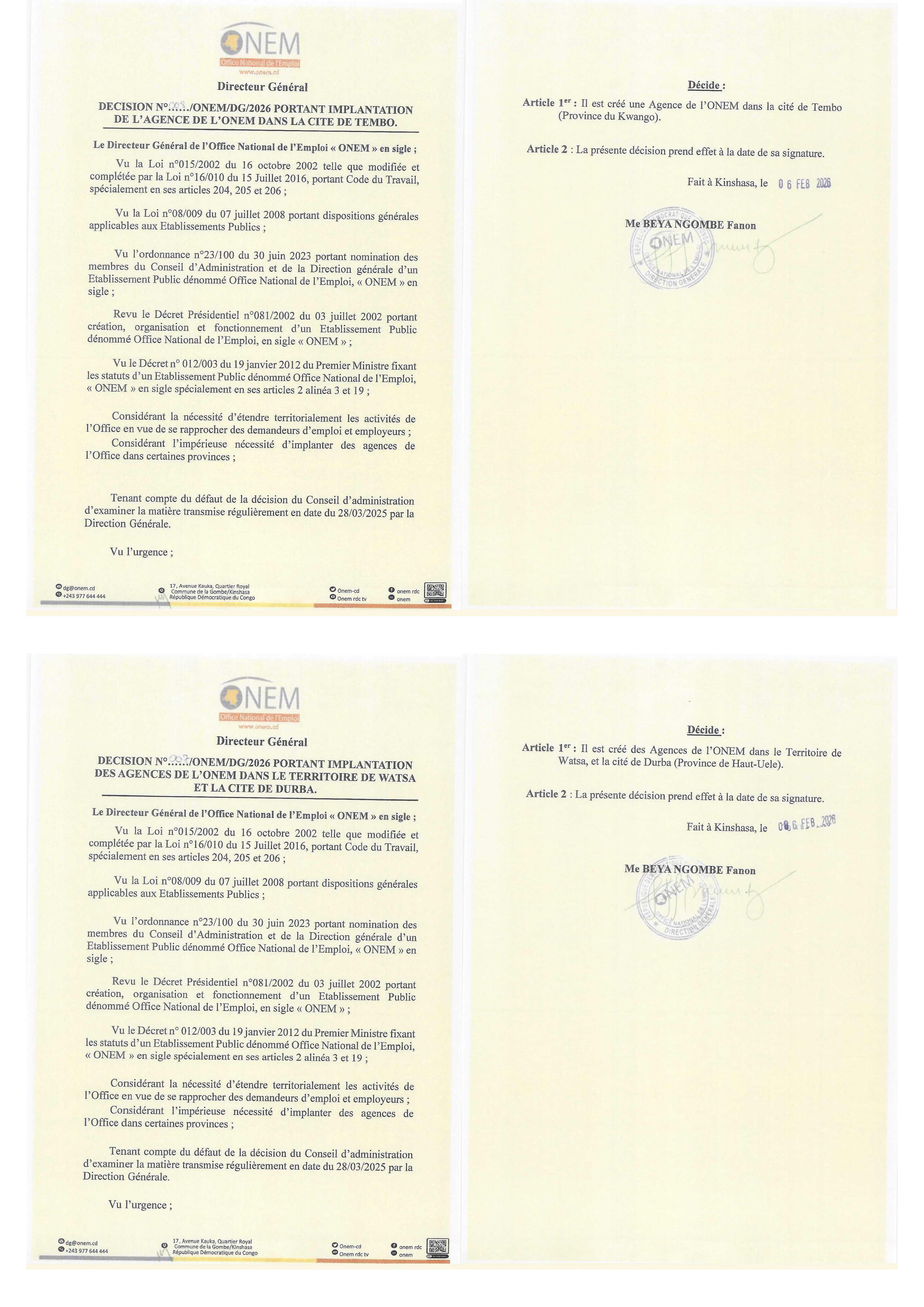 RDC : l’ONEM renforce sa présence en provinces avec de nouvelles agences